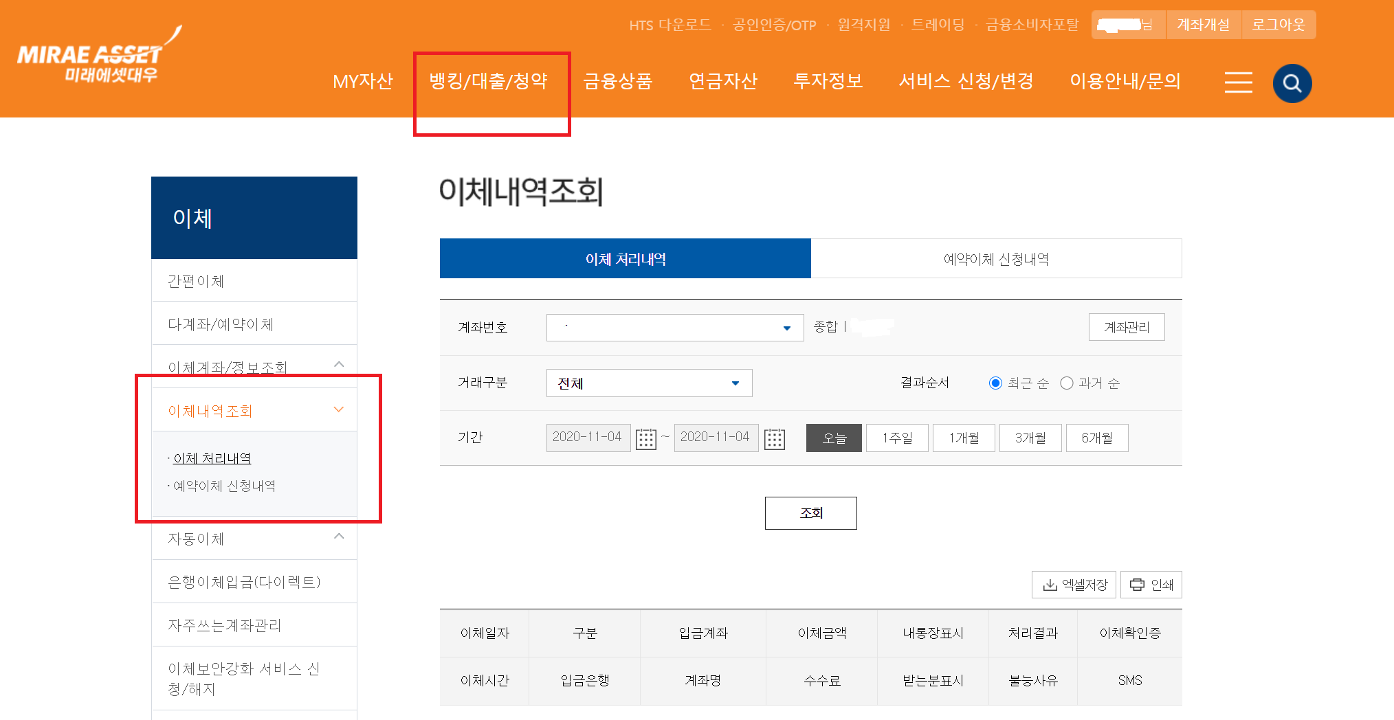 뱅킹/대출/청약☞이체☞이체내역조회