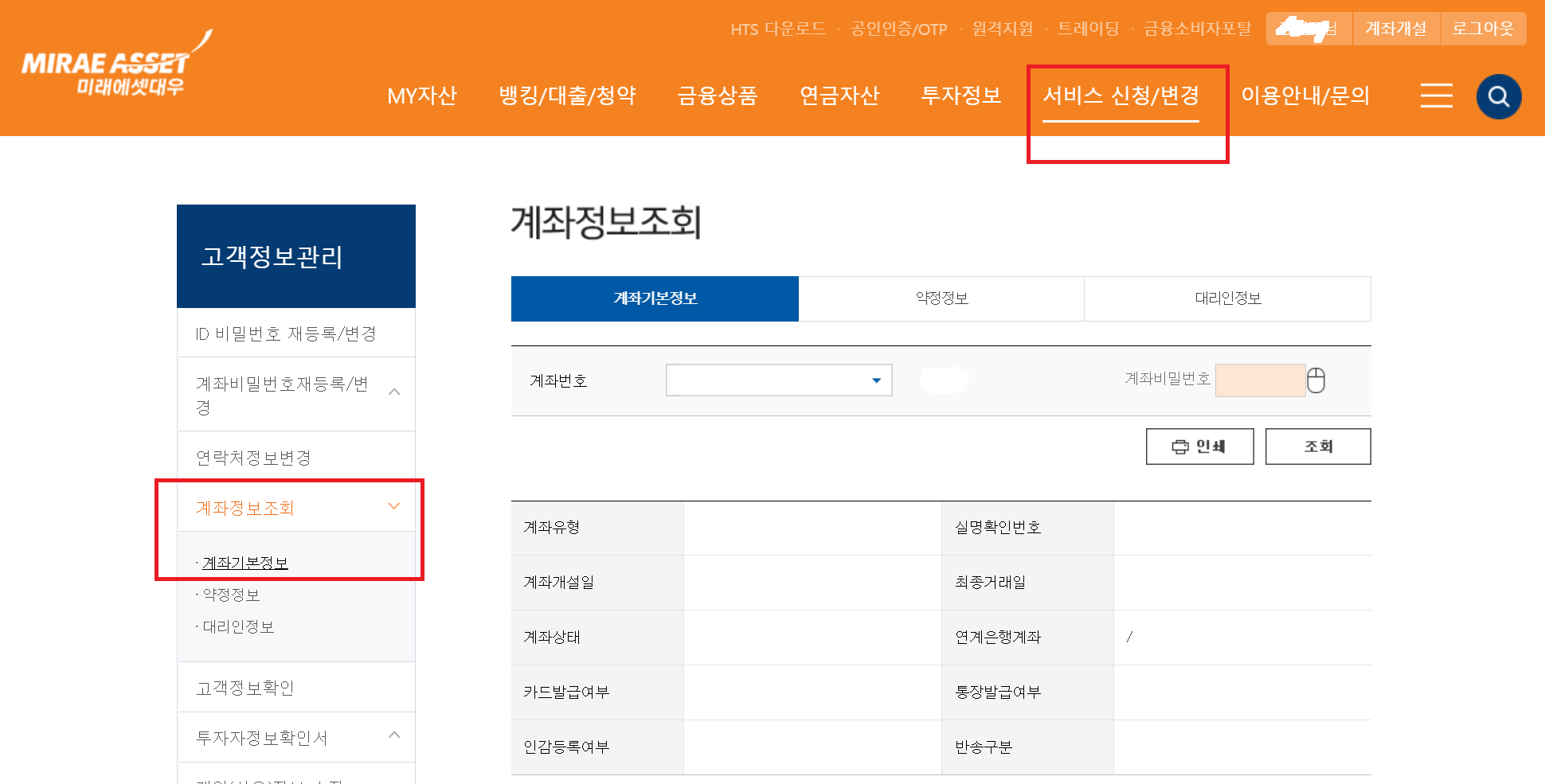서비스신청/변경 ☞고객정보관리☞계좌정보조회